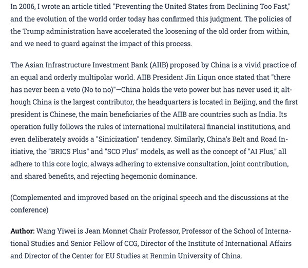 February 28 , 2026Wang Yiwei,a senior research fellow at Center for China and Globalization (CCG), a senior research fellow at the Institute of Global and Area Studies, Renmin University of China.